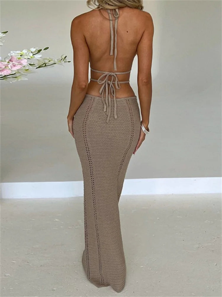 Sexy Knitted Cut Out Halter Backless Long Dress